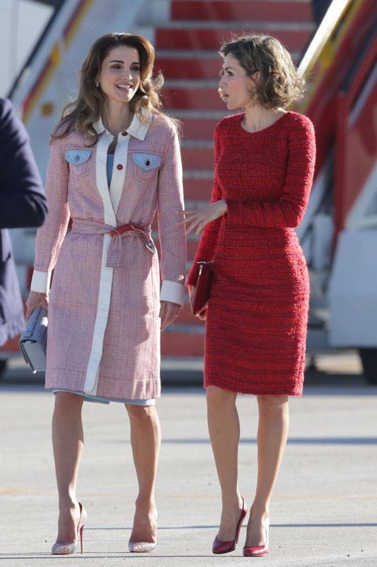 Para a ocasião a soberana espanhola elegeu um vestido vermelho, uma criação do seu estilista preferido, Felipe Varela, que tinha estreado em novembro do ano passado, que conjugou com clutch e sapatos vermelhos. Já Rania optou por um vestido azul claro, que estava escondido por um casaco em tons de vermelho, com pormenores em branco e azul. O visual da rainha jordana, adepta de vários estilistas de renome internacional, foi completado com uns sapatos animal print de Christian Louboutin e uma clutch azul.