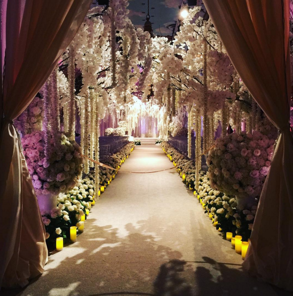 A noiva caminhou até ao altar de braço dado com o filho, Manolo, de 23 anos, num vestido de Zuhair Murad. O corredor, até ao altar, foi decorado pelo célebre artista floral Jeff Leatham, com rosas brancas e velas amarelas. O noivo usou um smoking John Varvatos.