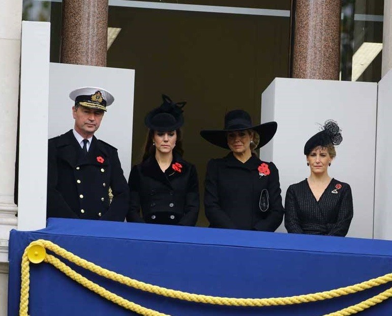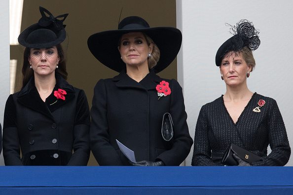 Kate e Maxima, ambas elegantes em looks pretos, assistiram ao evento da varanda, acompanhadas pela duquesa de Wessex, Sophie.