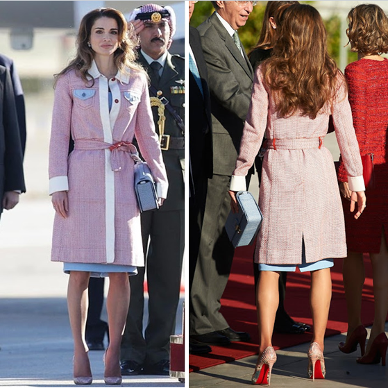 Para os últimos atos no país vizinho, a rainha destacou-se com um saia midi plissada da criadora Proenza Schouler, que custa 1835 euros, que combinou com um blusa branca com aberturas nas mangas de Alexander McQueen, de 1200 euros. Para completar o look Rania voltou a calçar uns sapatos Christian Louboutin, de 400 euros, e elegeu uma carteira Louis Vuitton, de 800 euros. Para dar cor ao visual usou um cinto vermelho de Azzedine Alaïa, que tem o valor 850 euros. No total, este look custa 5084 euros.