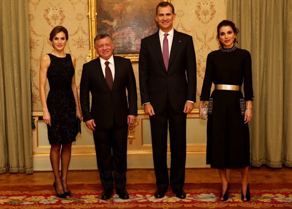 Para o jantar privado com os reis de Espanha, a soberana elegeu um vestido negro com mangas e uma gola redonda com aplicações da Givenchy, que tem o valor de 1300 euros. A rainha usou uma clutch da marca Sarah’s Bag, de 394 euros, e uns “peep toes” da Balenciaga, de 420 euros. O visual custa 2114 euros.