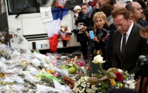 “Paris, amo-te e rezo por ti”, escreveu o antigo governador republicano da Califórnia num bilhete que assinou com o seu primeiro nome e que deixou numa coroa de rosas e orquídeas, em tons de amarelo e cor-de-rosa.