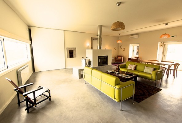 estar e lareira, e espaços exteriores (como piscina, parque para crianças e horta biológica)