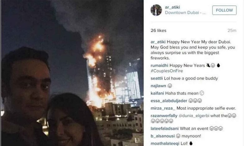 Um casal publicou no Instagram uma “selfie” tirada no momento em que decorria o incêndio no hotel Adress Downtown, no Dubai. A mensagem que acompanha a imagem está a dar que falar e não pelos melhores motivos.