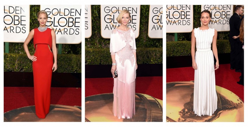 – Cate Blanchett manteve o bom gosto a que já nos habituou. A atriz que estava nomeada ao prémio de melhor atriz num filme dramático por “Carol”, estava deslumbrante num vestido de Givenchy, rosa claro com transparências e franjas. O cabelo, a maquilhagem, a escolhas das jóias e da clutch, lindo!