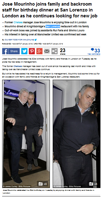 Assim, reuniu familiares e amigos mais próximos no restaurante italiano San Lorenzo, em Londres, cidade onde decidiu continuar a viver, para um jantar festivo. A mulher do técnico, Matilde, os filhos, José e Matilde, assim como Rui Faria e Silvino Louro cantaram os parabéns ao técnico. O grupo foi “apanhado” pela imprensa britânica a sair do restaurante.