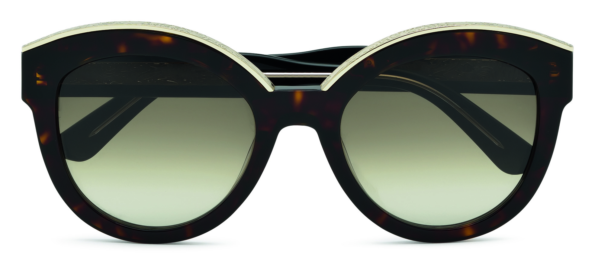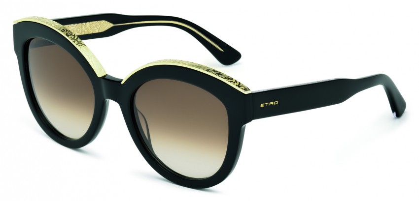 Os anos 50, o cinema drive-in, as saias rodadas e o twist. As divas usavam os óculos de sol mais icónicos daquele período, destinados a tornarem-se eternos: os óculos cat eye. A Etro reinterpreta esses mesmo óculos e o mood, lançando os novos óculos de sol Marquetry, produzidos em acetato com preciosas ramagens douradas que exaltam a sua feminilidade. A armação é sinuosa e espessa, enquanto os detalhes paisley em ouro inserem-se, semiocultos, na parte superior da frente e no lado interno das hastes.