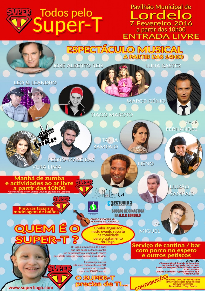 A partir das 14h00, um espectáculo musical com um variado leque de artistas animará o público presente. Refira-se que quer no período da manhã, quer no período da tarde a entrada é gratuita para todos aqueles que queiram participar e dessa forma ajudar o Super-T nesta luta.