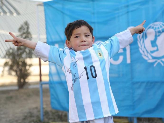 A Unicef publicou no Facebook fotos que mostram o menino afegão, de cinco anos, a usar uma das camisolas enviadas pelo jogador do Barcelona.