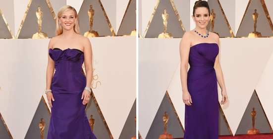 Além de chegarem à passadeira vermelha praticamente ao mesmo tempo, as duas apostaram em looks muito parecidos: vestidos sem alças, com cintura marcada e da mesma cor – roxo. Enquanto Tina completou o modelo da Versace com um colar de diamantes e safiras, Reese optou por conjugar brincos e muitas pulseiras de diamantes com a criação de Oscar de La Renta.