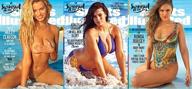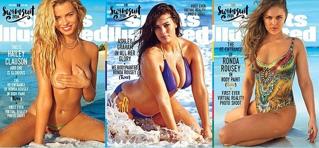 Ronda Rousey, atleta da MMA de 29 anos, surge com o corpo pintado, dando a ilusão de que está a usar um fato de banho. Já Hailey Clauson, de 20 anos, aparece em topless. Por fim, Ashley Graham, de 26 anos, faz história, ao tornar-se a primeira modelo plus size a figurar na capa da famosa revista.