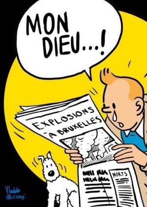 Criados pelo cartunista belga Georges Remi, conhecido como Hergé (1907-1983), o repórter Tintim e o seu cão Milu são um símbolo da Bélgica e as suas imagens inundaram as redes sociais, ao lado de hashtags como #JeSuisBruxelles (#SouBruxelas) e mensagens de apoio à população belga.
