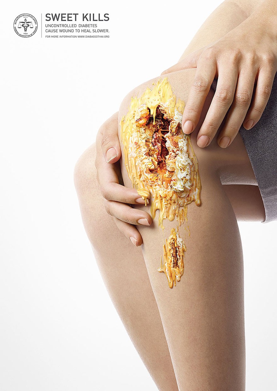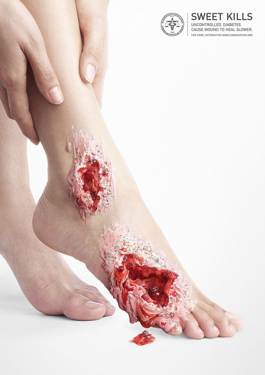 No sentido de alertar para os perigos do consumo excessivo de açúcar, a Associação de Diabetes da Tailândia lançou a campanha “Sweet Kills — Uncontrolled diabetes cause wound to heal slower” (Os doces Matam — Diabetes descontrolada faz com que feridas curem mais devagar”, em português). As imagens da ação estão a dar que falar e parecem não deixar ninguém indiferente.