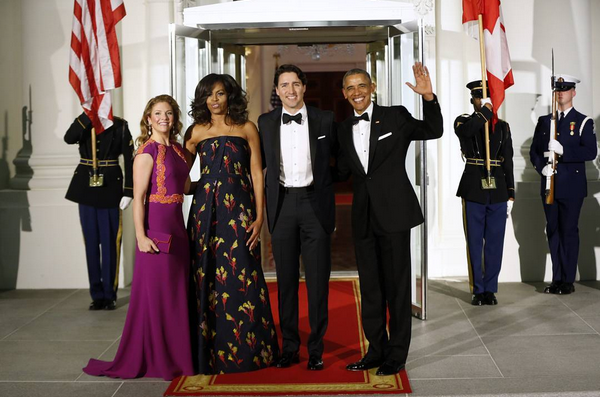 As filhas de Barack e Michelle Obama marcaram presença no jantar oferecido em honra do primeiro-ministro canadiano, Justin Trudeau, e da sua mulher, Sophie Gregoire-Trudeau, e receberam uma menção especial no discurso do governante.