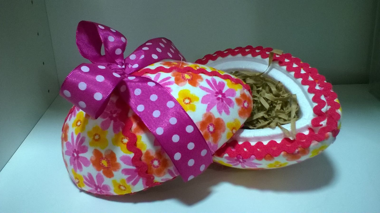 “Ovos com base em chacota, pintados, com pormenores em Eva glitter e fita”, somam-se prontos a levar as iguarias da época, havendo também “ovos com base em esferovite forrado a tecido, com fitas e laços”.
