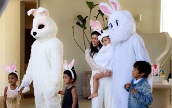 O rapper quis surpreender a filha mais velha, North, e não se inibiu de se vestir de coelho da Páscoa, no domingo, durante as celebrações da data. Tyga, o namorado de Kylie Jenner, também ajudou à festa, e usou uma máscara semelhante.