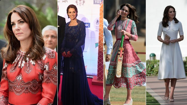 Para visitar o país asiático, Kate adotou alguns looks mais boho e étnico do que o habitual, desfilado criações de inúmeros estilistas. Depois de chegar àquele país num vestido Alexander McQueen, a mãe de George e Charllote usou Temperly London, Emilia Weakstead, Jenny Packham, Anita Dongre e Zara.