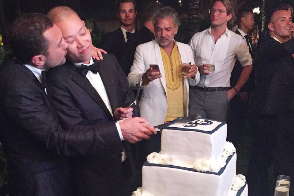 Vestidos de igual, Jason Wu e o empresário brasileiro trocaram alianças perante familiares e amigos numa festa ao ar livre.