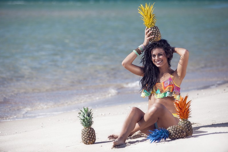 A beleza exótica de Carol, como é carinhosamente tratada, funde-se com o espírito jovial e fresco da coleção, de cortes originais e padrões irreverentes, composta por biquínis, triquínis, fatos de banho e roupa de verão – onde predominam os coloridos padrões de influência étnica.