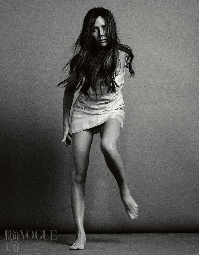 De cabelo desarranjado e em poses quase acrobáticas, Victoria Beckham, que teve aulas de ballet clássico, revela uma elasticidade surpreendente.