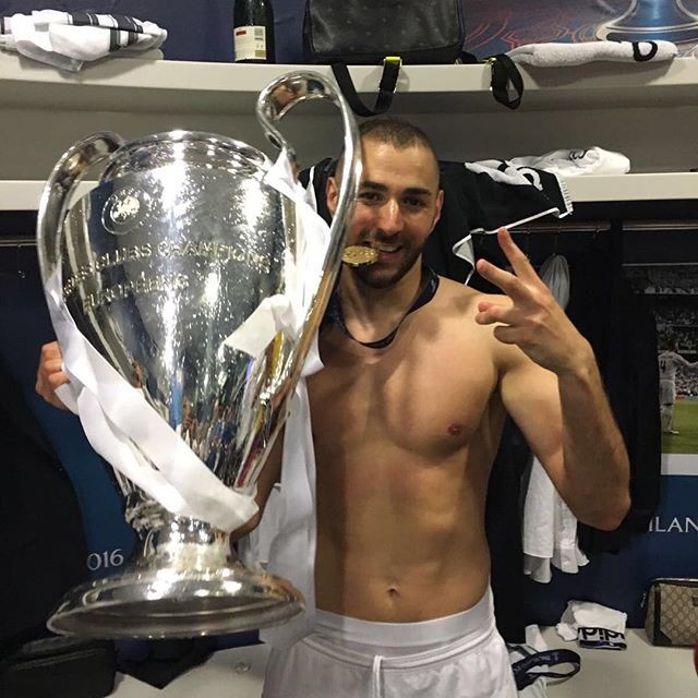 Benzema agarrado ao troféu e à medalha