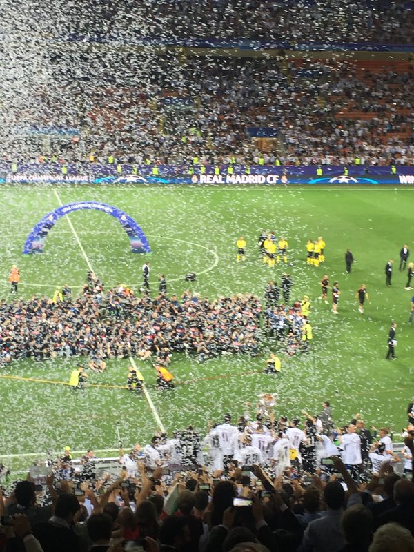 A festa do Real Madrid começou, contudo, quando Cristiano Ronaldo converteu o penálti decisivo. Mais tarde, os campeões europeus subiram à tribuna de honra e mostraram a conquista ao público presente. Depois passearam o troféu pelo relvado do Estádio Giuseppe Meazza e Richard Gere também teve direito a ser fotografado com ele, bem como os futebolistas campeões e as suas respetivas famílias. A celebrações prosseguiram no balneário, tiveram novo ponto alto no voo de regresso a Espanha e chegaram, agora, às ruas de Madrid.