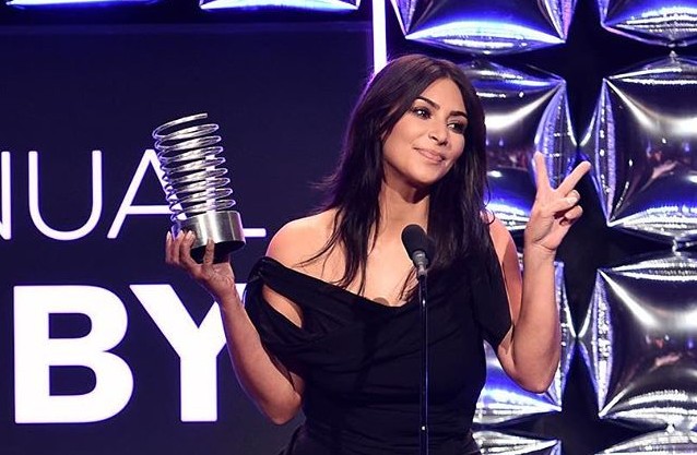 O “Break The Internet Award” (uma categoria criada especialmente para Kim, já que os organizadores do prémio consideram “corajosa e criativa” a maneira como ela utiliza a internet) foi entregue à socialite por suas polémicas selfies e capas de revistas em que aparece completamente nua, deixando pouco para a imaginação.
