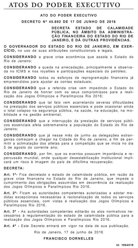 Francisco Dornelles, governador do Rio de Janeiro, assumiu a “grave crise financeira”, que esvaziou os cofres estaduais. Por isso, teme o “total colapso na segurança pública, na saúde, na educação, na mobilidade e na gestão ambiental.” Perante esse cenário, decidiu decretar o estado de calamidade pública.