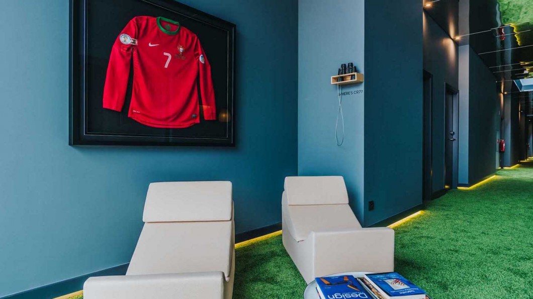 Desde o chão que apresenta a cor verde, imitando o relvado de um estádio de futebol, a pequenos detalhes que remetem para a figura de Cristiano Ronaldo, nada foi esquecido.