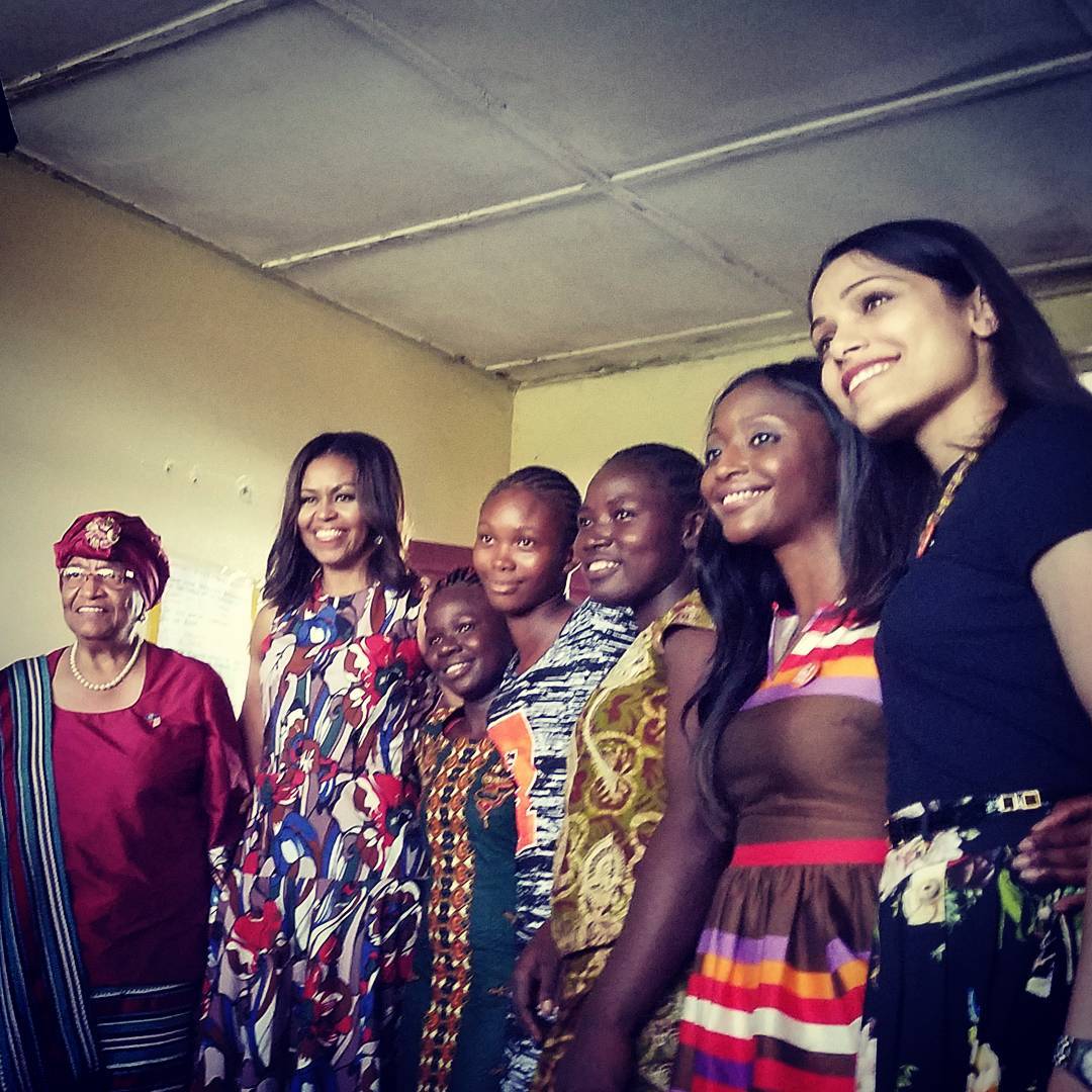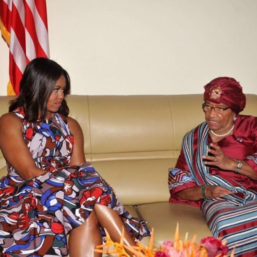 Durante a visita a Kakata, perto de Monróvia, Michelle fez-se acompanhar da presidente liberiana, Ellen Johnson Sirleaf.