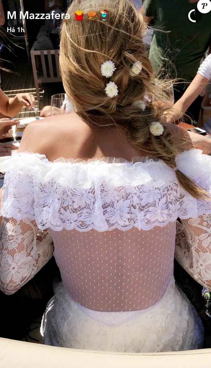Para a ocasião, escolheu um look boho chic assinado por Alessandra Rich, e o cabelo apanhado numa trança adornada com pequenas flores.