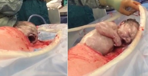 Nas imagens, o bebé é colocado apenas com a cabeça para fora e, com um pouco de dificuldade, tira o braço direito de dentro da barriga para, depois, usar sua própria força para sair. No vídeo é possível ouvir os médicos e enfermeiros encantados com o nascimento.