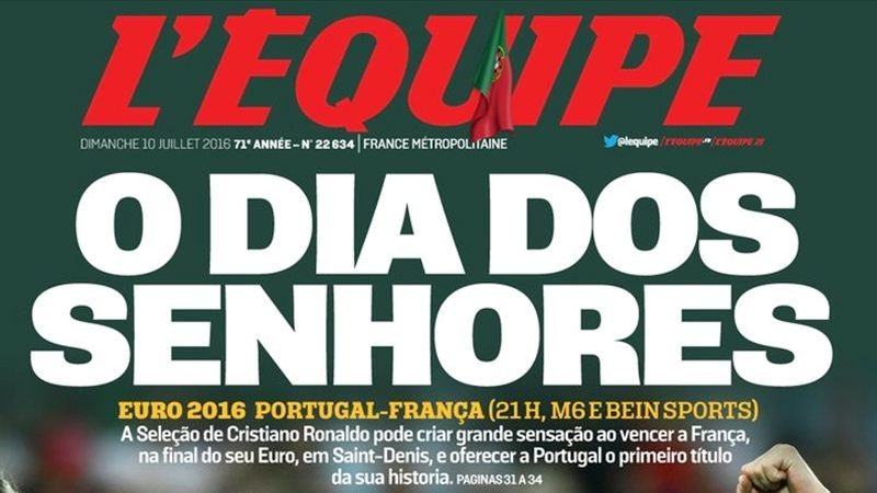 Não, a imagem que surge aqui em cima não é uma fotomontagem. A edição deste domingo, 10 de julho, do conceituado jornal desportivo francês, “L’Équipe”, tem mesmo uma capa escrita em português.