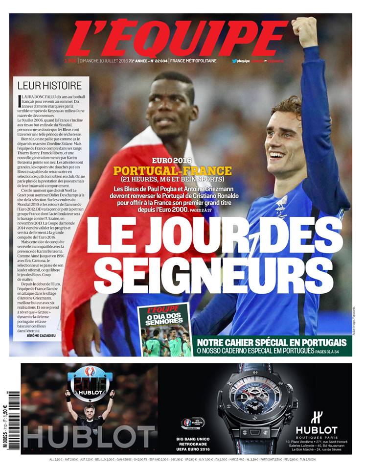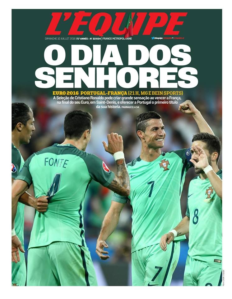 Na manchete portuguesa do diário gaulês, intitulada “O Dia dos Senhores”, lê-se ainda: “A Seleção de Cristiano Ronaldo pode criar grande sensação ao vencer a França na final do seu Euro, em Saint-Denis, e oferecer a Portugal o primeiro título da sua história.” Tudo isto sobre uma imagem onde surge o capitão da equipa das quinas a festejar com Fonte, Bruno Alves e João Moutinho, após o jogo das meias-finais, frente ao País de Gales.