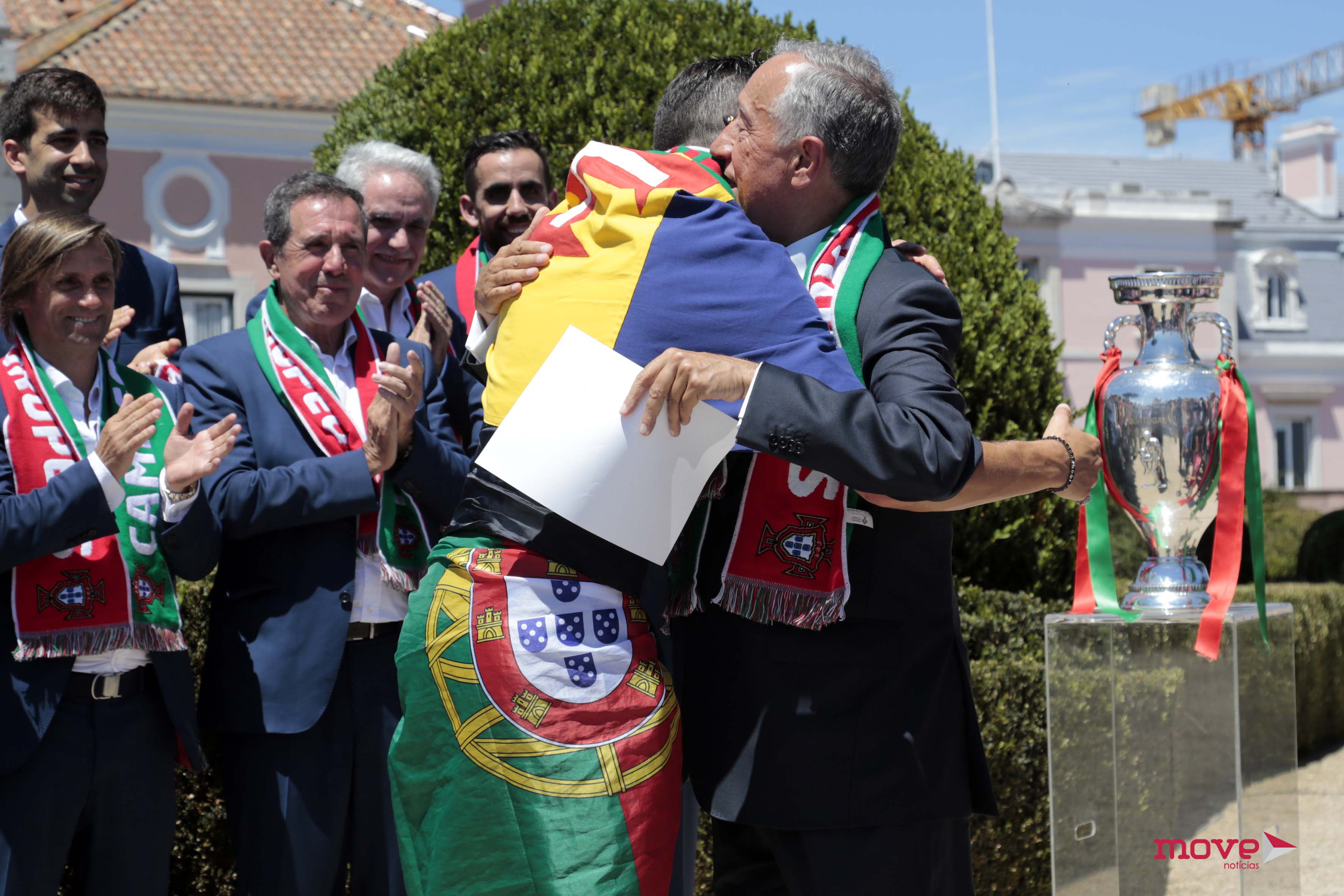 Com a taça nas mãos, o chefe de Estado assomou-se à varanda dos jardins do Palácio de Belém onde, em uníssono com os populares que esperavam para ver os jogadores na frente do edifício, entoou ‘A Portuguesa’.
