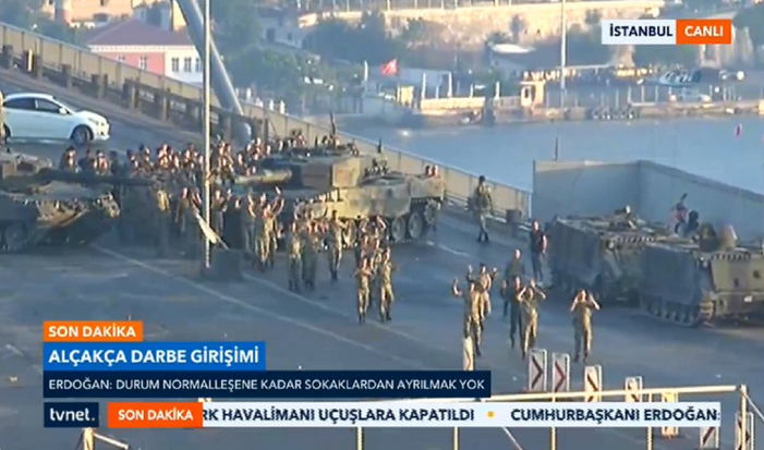 O acesso às pontes sobre o Bósforo, que liga a Europa e Ásia, foi cortado e tomaram posições em vários locais de Ancara, a capital, e de Istambul, por volta das 23h00 locais (menos duas em Portugal). Houve confrontos, explosões e tiros disparados nas ruas e edifícios governamentais, numa noite em que Erdogan estava num hotel no sul do país. Vários populares pró e contra o golpe de Estado saíram para a rua.