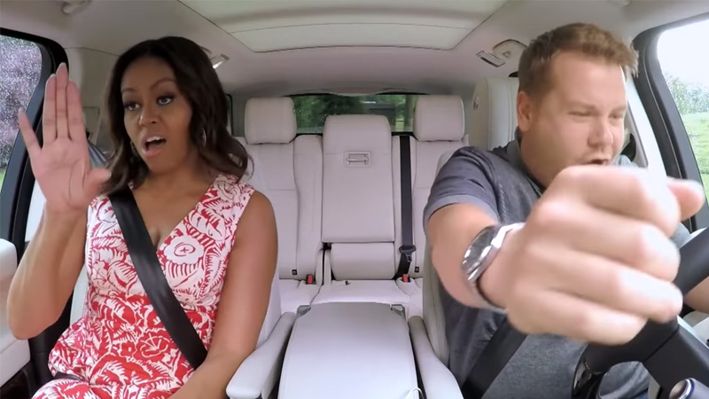 Convidada pelo ‘The Late Show’, a mulher de Barack Obama entrou no carro de James Corden para protagonizar um hilariante momento musical.