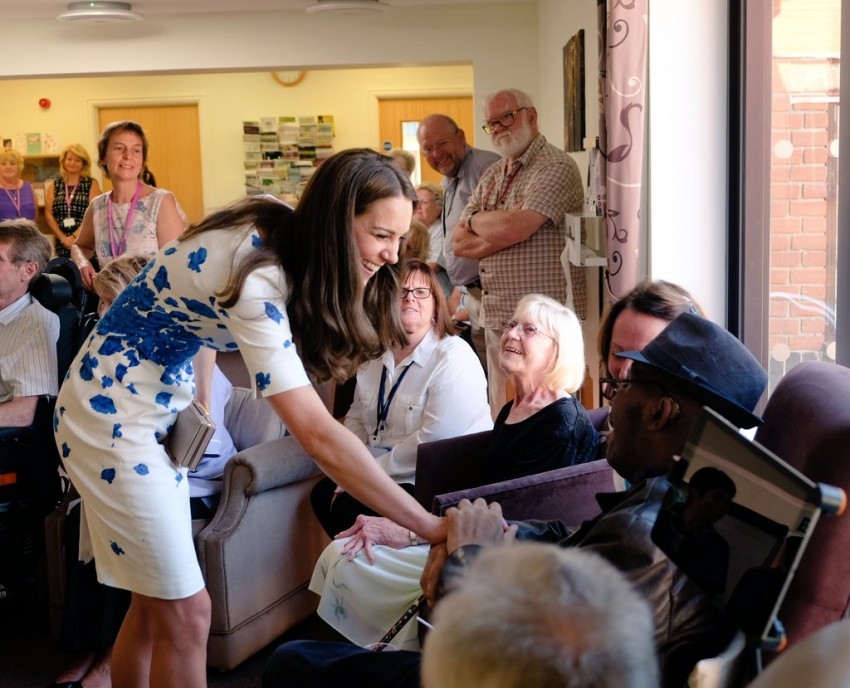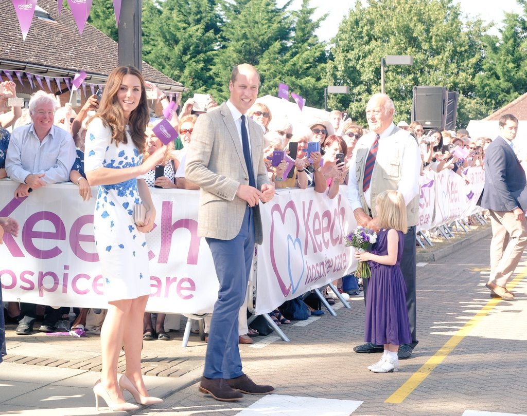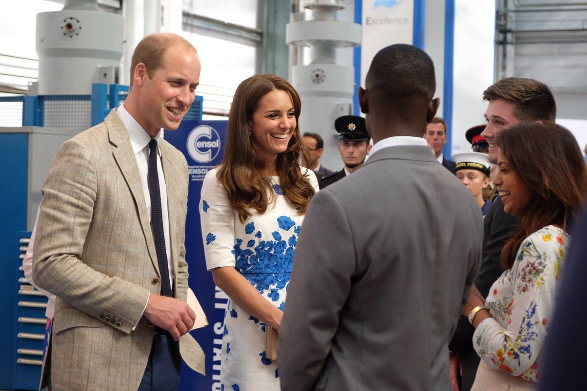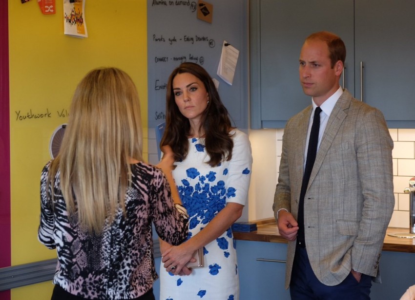 A mulher do príncipe William, de 34 anos, escolheu o modelo branco e azul Lasa Poppy Print Dress de LK Bennett para os atos oficiais. O casal passou pelo hospício Keech Hospice, pelo Centro de Youthscape e pela empresa de design Hayward Taylor Group.