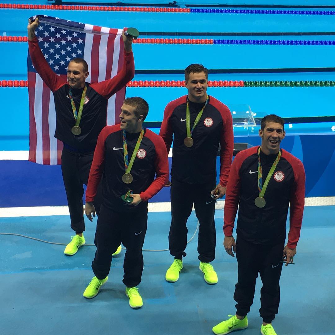 Composta por Caeleb Dressel, Michael Phelps, Ryan Held e Nathan Adrian, a equipa venceu a prova em 3.09,92 minutos, menos 61 centésimos de segundo do que a equipa francesa, que há quatro anos tinha batido os Estados Unidos em Londres, dando a Phelps a 19ª ouro num total das 23 medalhas olímpicas que venceu ao longo da sua carreira.