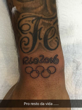 Ainda sem reatamento à vista, o que é certo é que o dia especial da camisola 10 da seleção brasileira vai ficar para a eternidade. Pelo menos no corpo dele. É que tatuou o logotipo dos Jogos Olímpicos do Rio de Janeiro e os arcos das Olimpíadas no pulso.