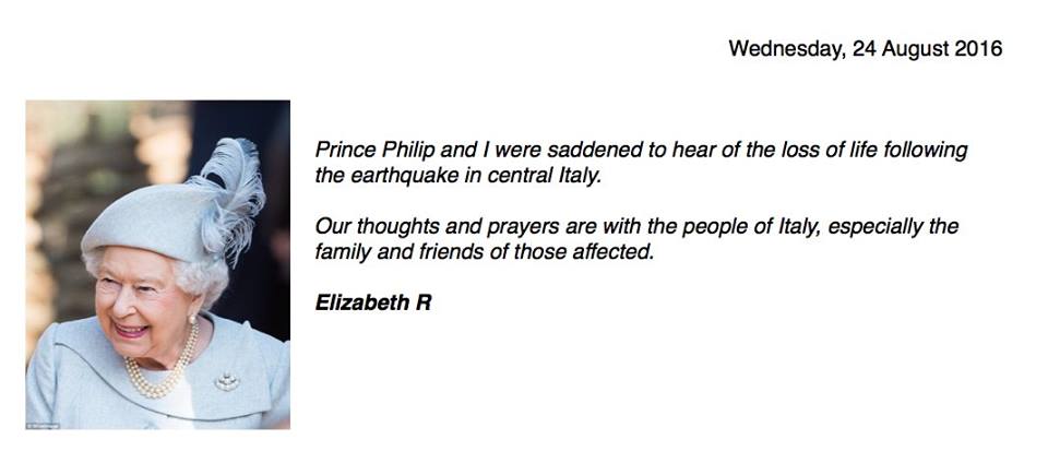 “O príncipe Filipe e eu ficamos desolados por saber da perda de vidas na sequência do terramoto no centro de Itália. Os nossos pensamentos e preces vão para todas as pessoas de Itália, especialmente para as famílias e amigos das vítimas”, disse a rainha Isabel II numa mensagem deixada ao primeiro-ministro italiano.
