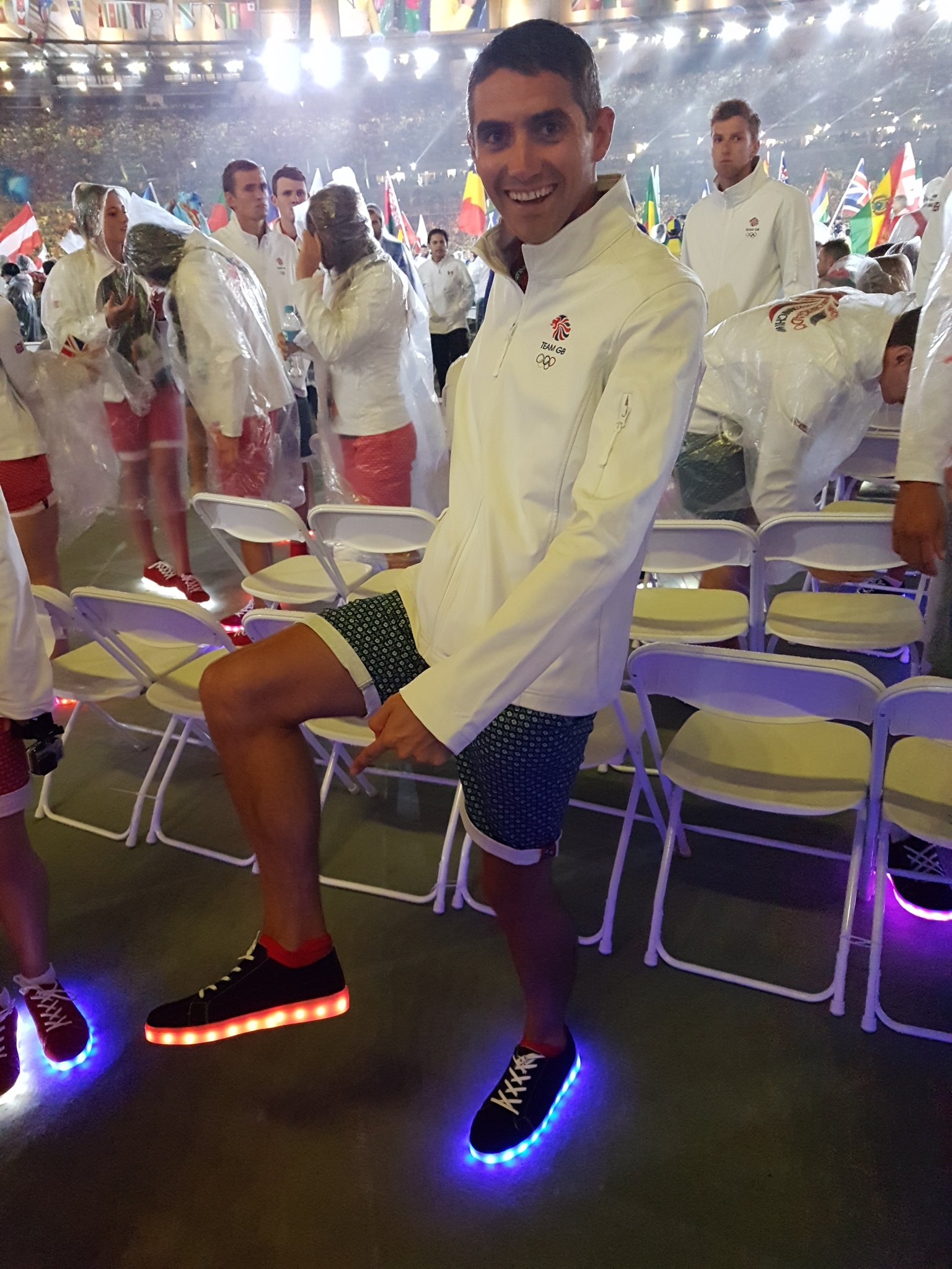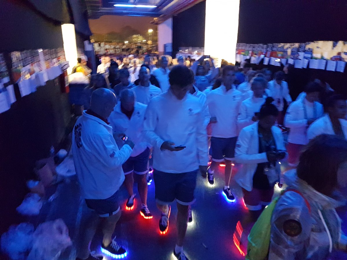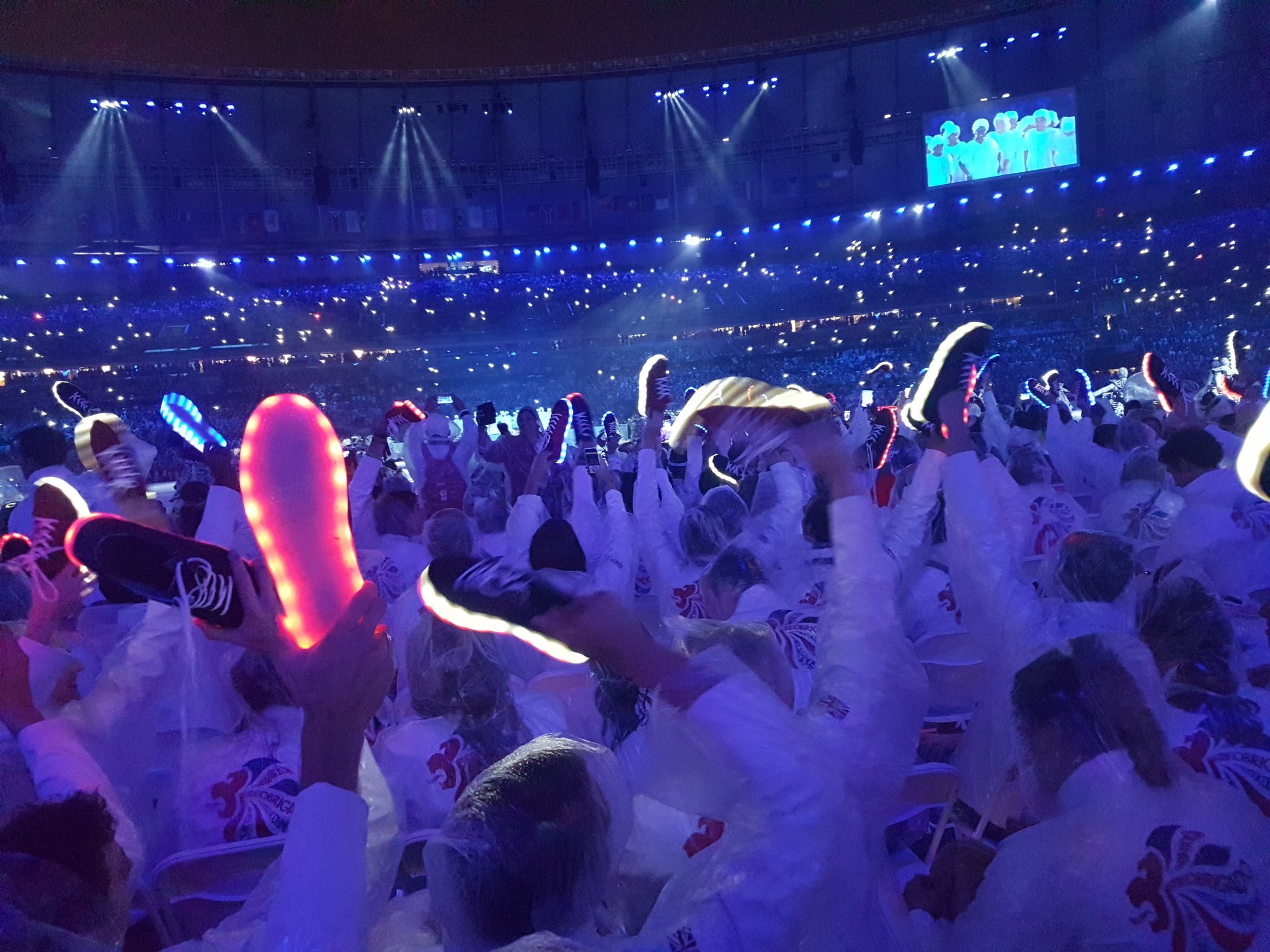 O calçado tem luzinhas, como se vê nalguns ténis das crianças, que mudavam entre as cores da bandeira do país: vermelho, branco e azul. Os atletas chegaram mesmo a tirar as sapatilhas e usaram-nas como lanterna ou isqueiros, como se estivessem num concerto.