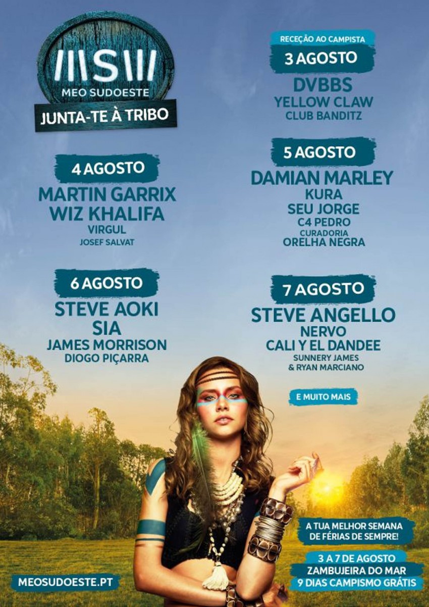 Os artistas Wiz Khalifa, Sia, Seu Jorge, DJ Steve Aoki e DJ Martin Garrix vão estar no festival Meo Sudoeste, que começa esta quarta-feira, 3, na Zambujeira do Mar, na costa alentejana.