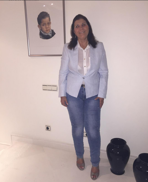Antes do jantar, posou para a fotografia em casa, ao lado de um quadro com o retrato do neto Cristianinho e mostrou o look escolhido. O menino, de seis anos, filho do campeão europeu de futebol e jogador do Real Madrid, acompanha a avó para quase todo o lado.