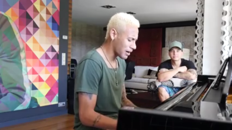 O futebolista do Barcelona e campeão olímpico de futebol pela seleção brasileira aparece a cantar ao piano, com um amigo a ouvir. E o resultado é este: