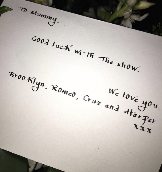 Na primeira fila, a assistir, estiveram o marido da ex-Spice Girl e o filho mais velho. Victoria recebeu ainda uma surpresa da família: um cartão grande a desejar boa sorte para o desfile.