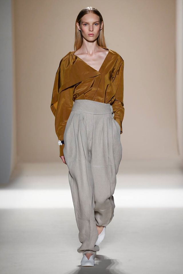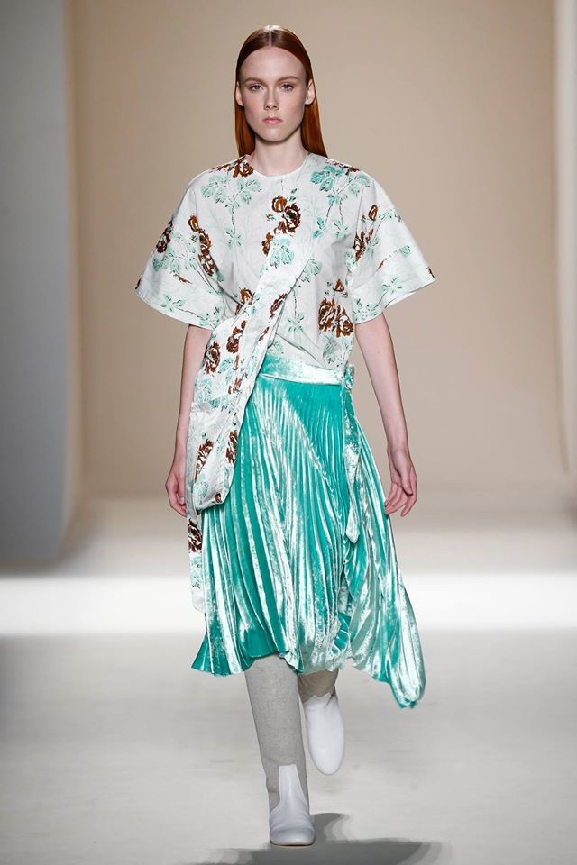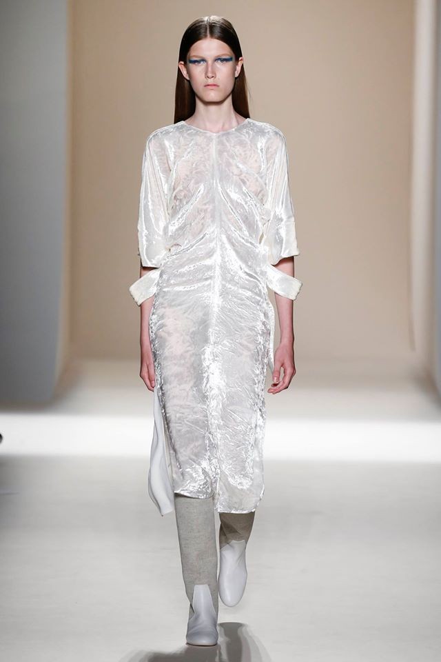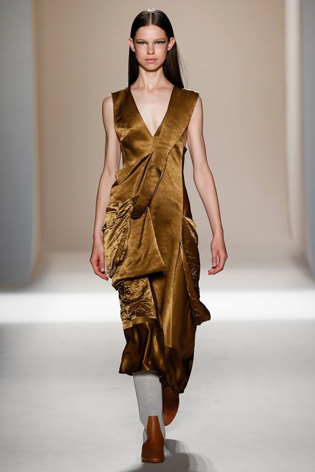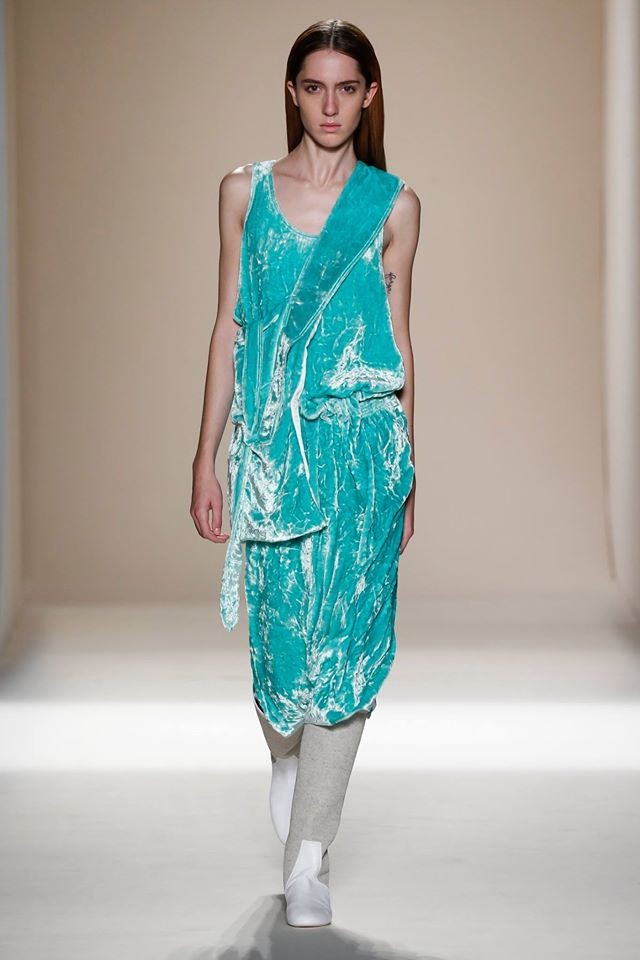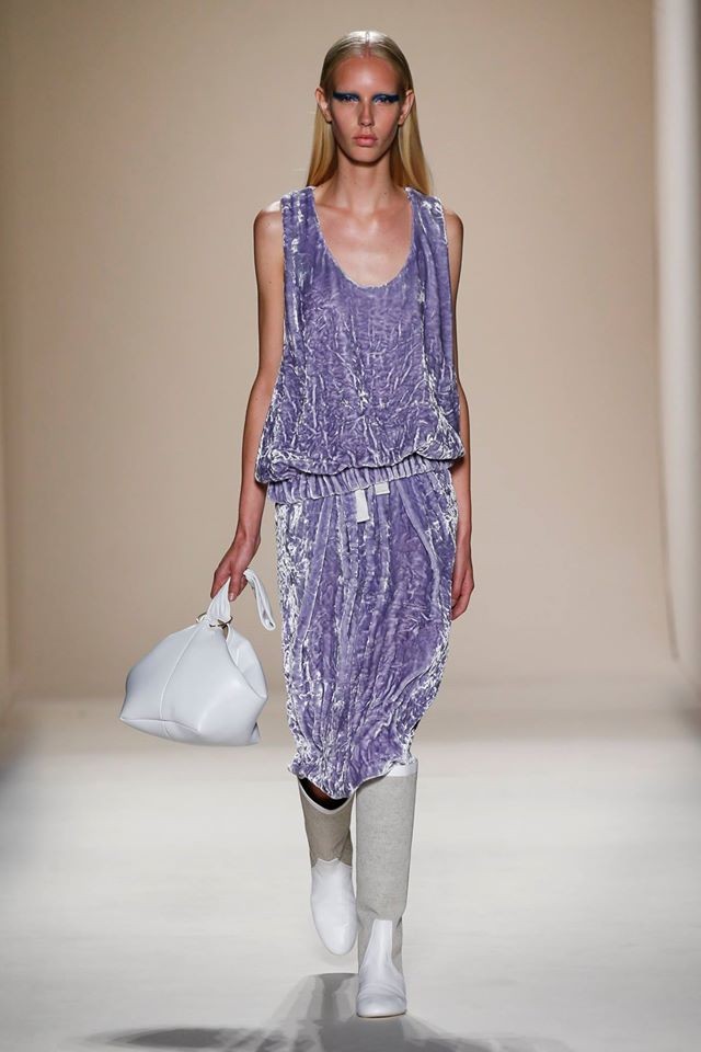 A coleção que Victoria apresentou é de “espírito livre”, como descreveu em entrevistas, com silhuetas fluidas e desconstruídas. As texturas usadas foram veludos, sedas lavadas e rendas.