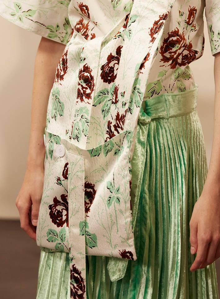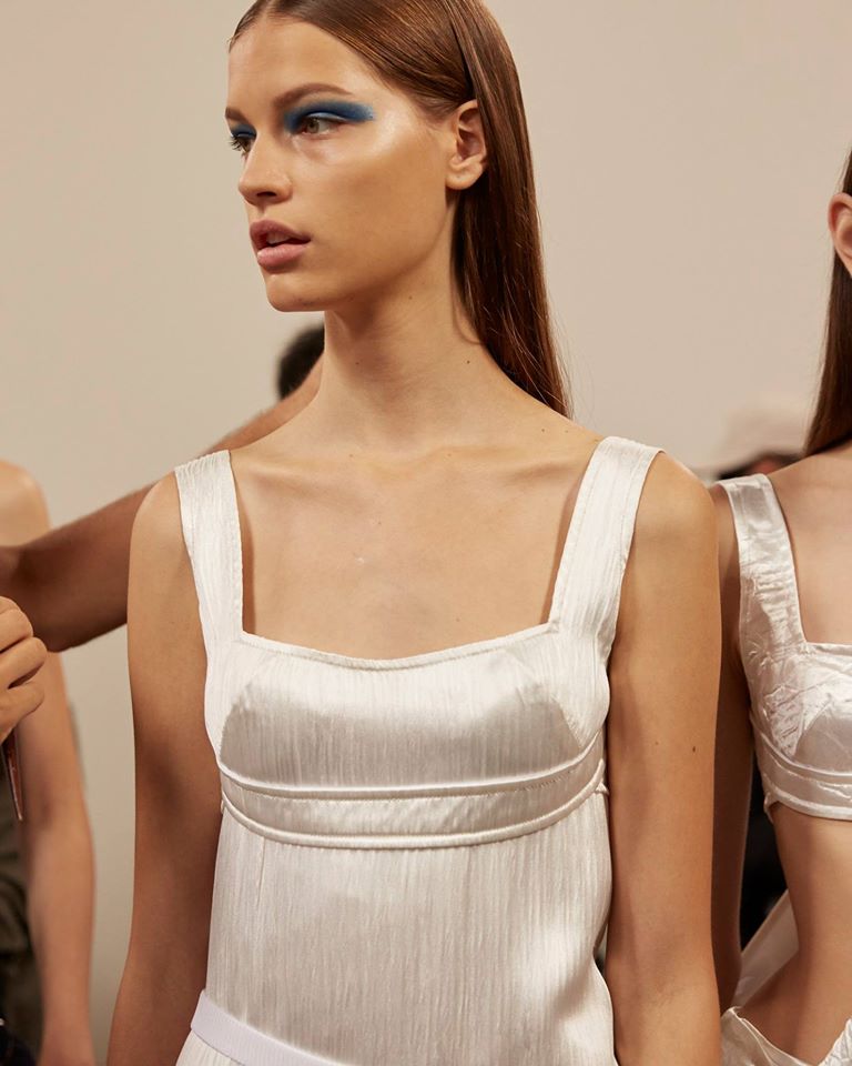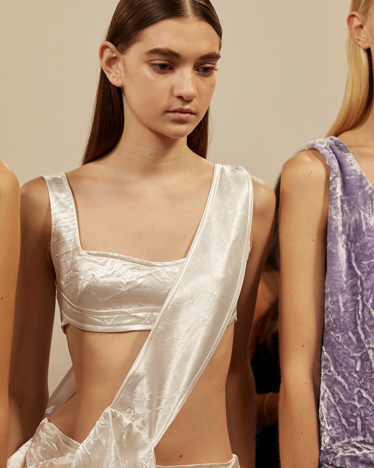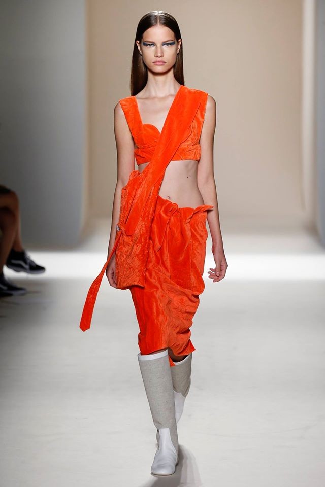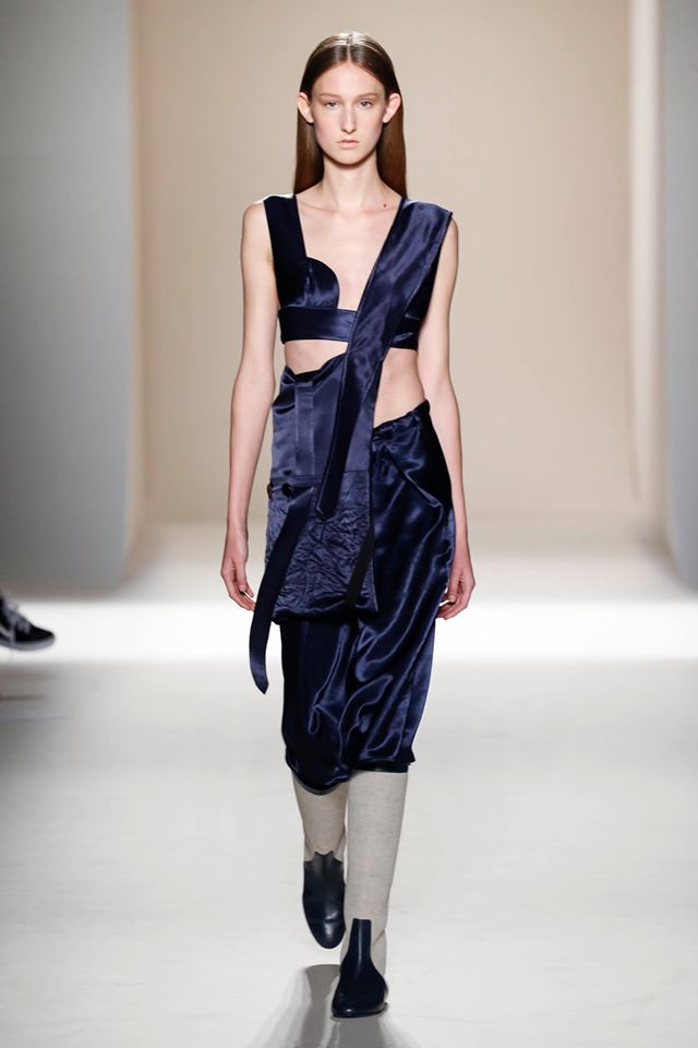 A coleção que Victoria apresentou é de “espírito livre”, como descreveu em entrevistas, com silhuetas fluidas e desconstruídas. As texturas usadas foram veludos, sedas lavadas e rendas.