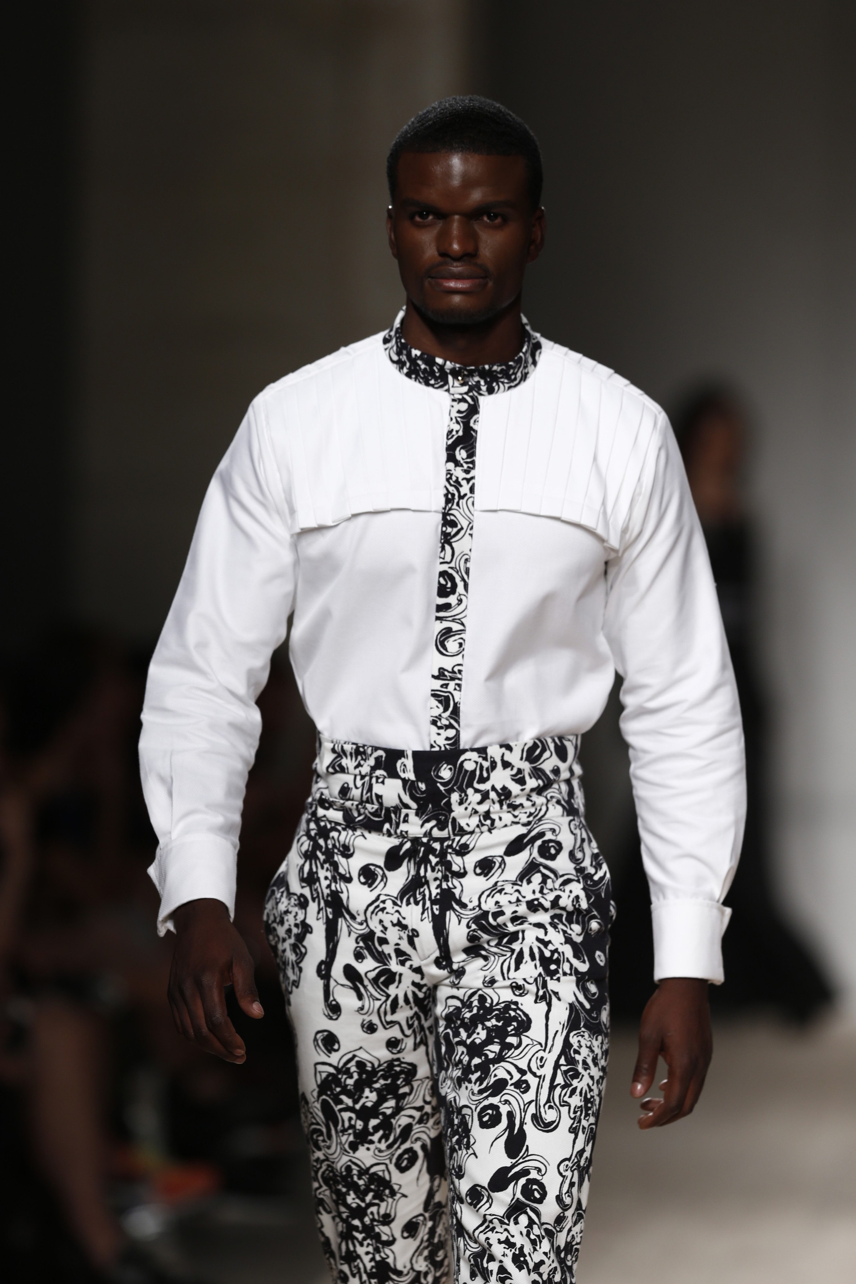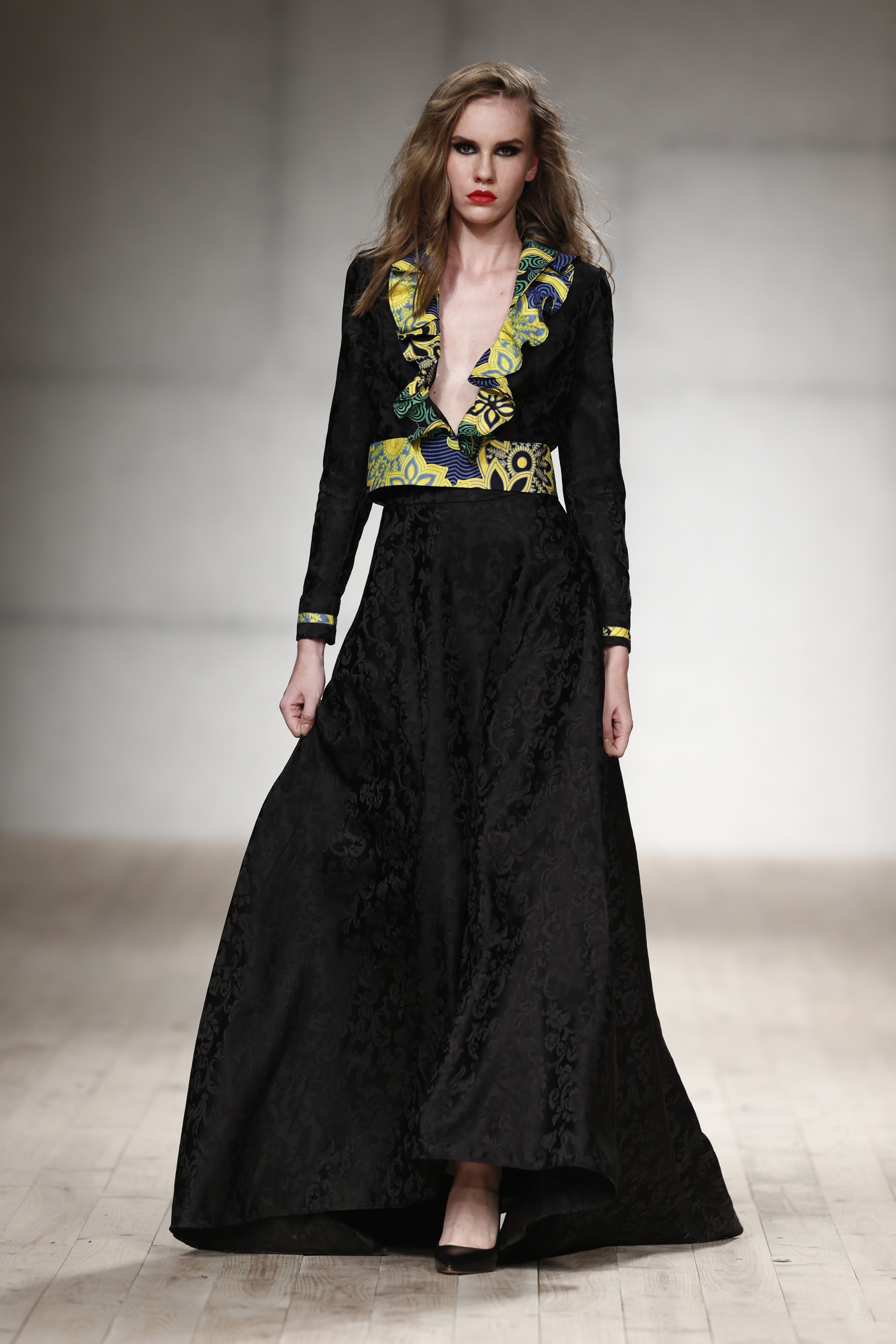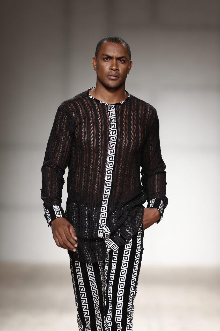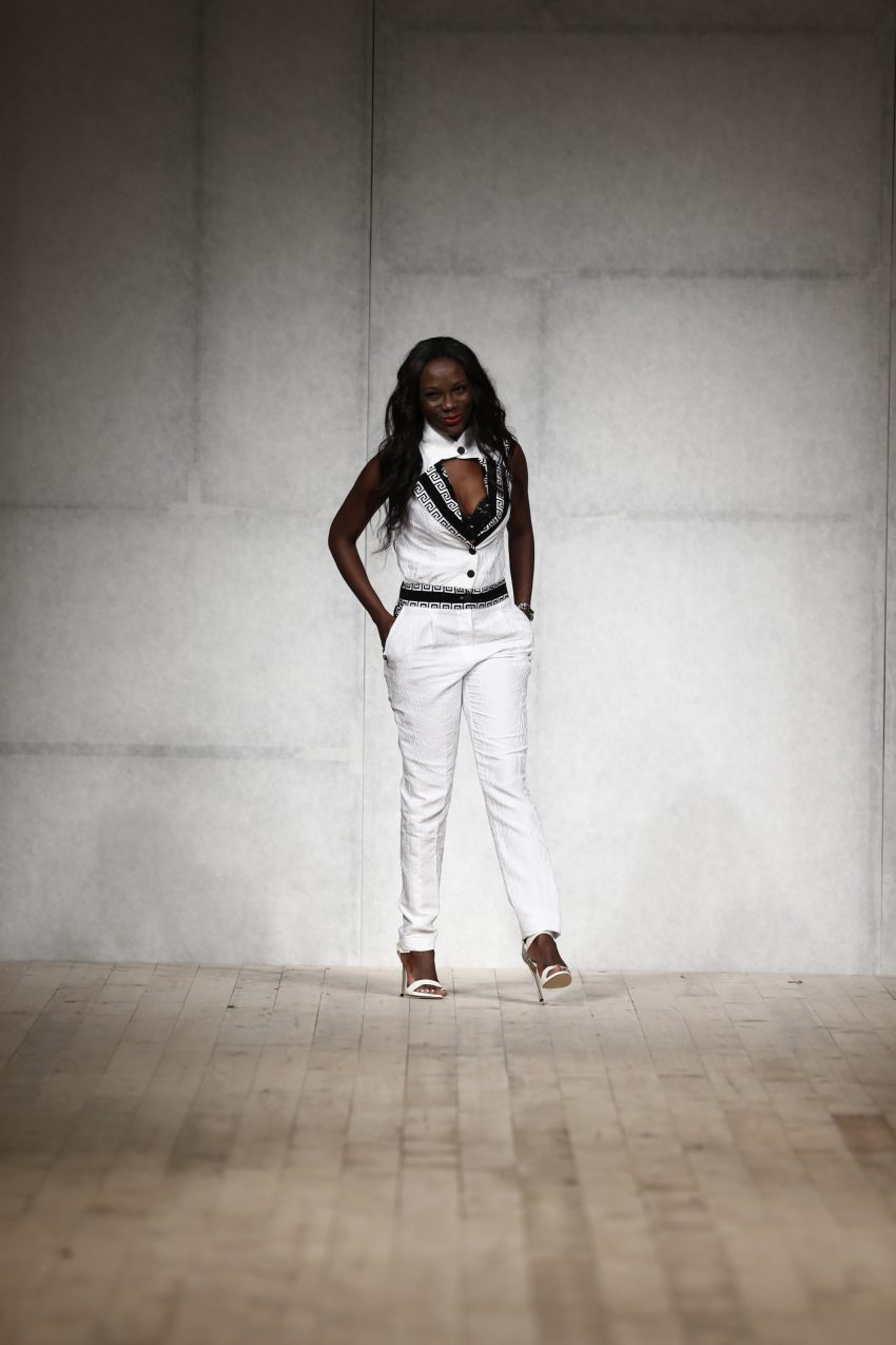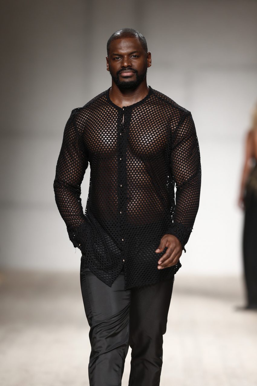 Drapeados, bordados, transparências, rendas e tecidos africanos dão corpo à peças da estilista que, entre os vários modelos que desfilaram as suas criações, teve dois nomes de peso: Fredy Costa e Maura Faial.
