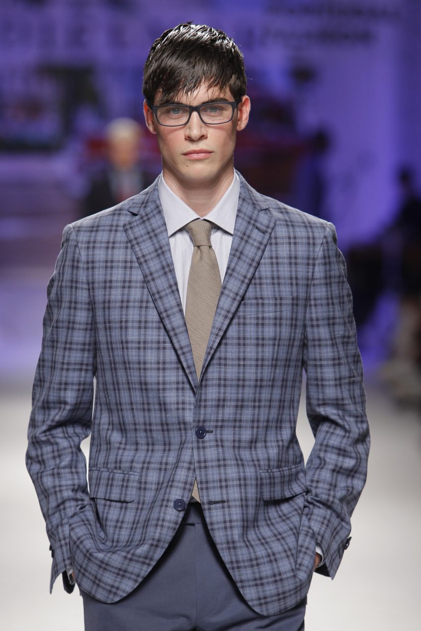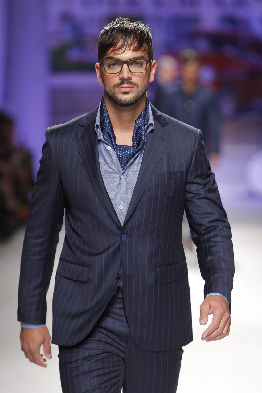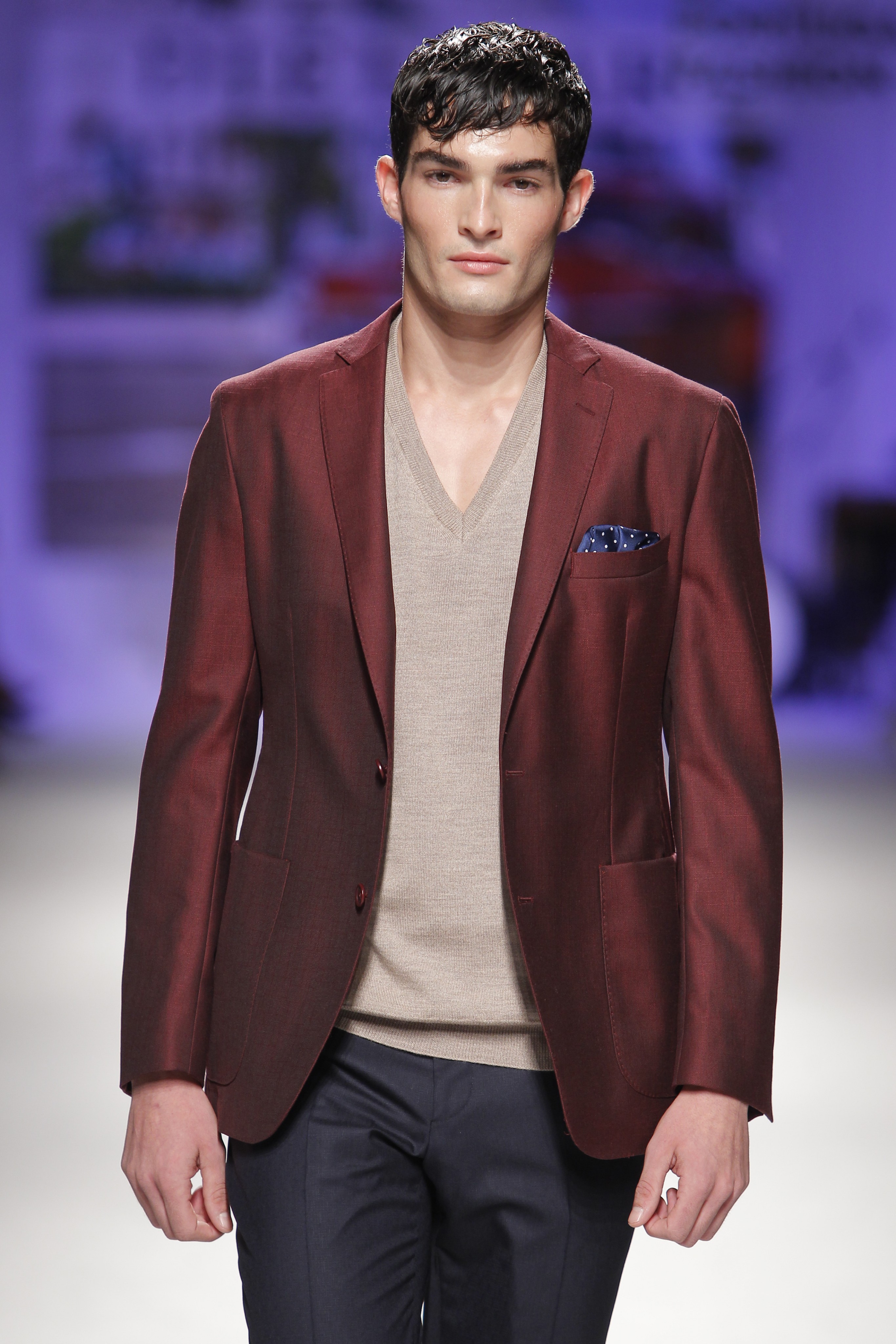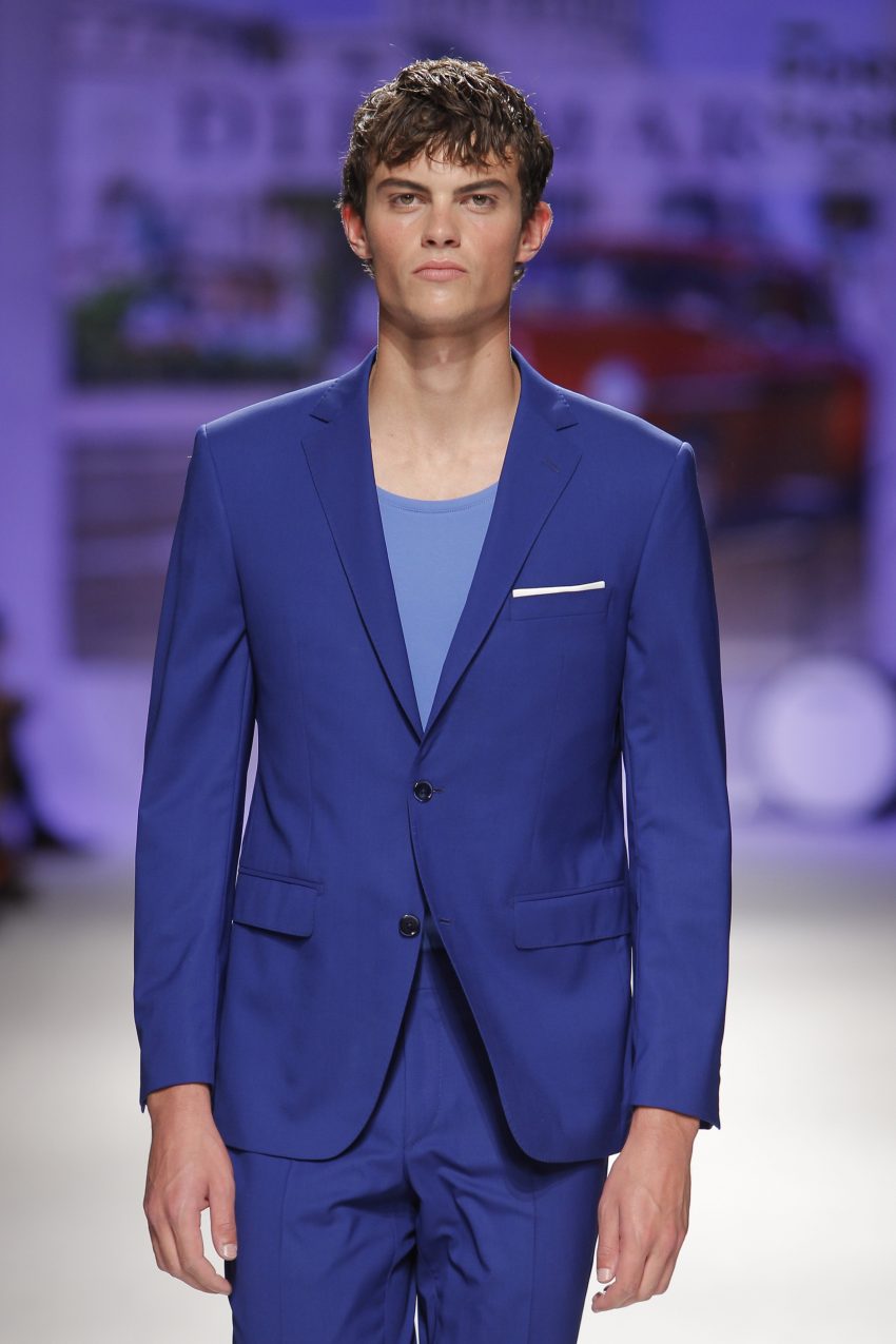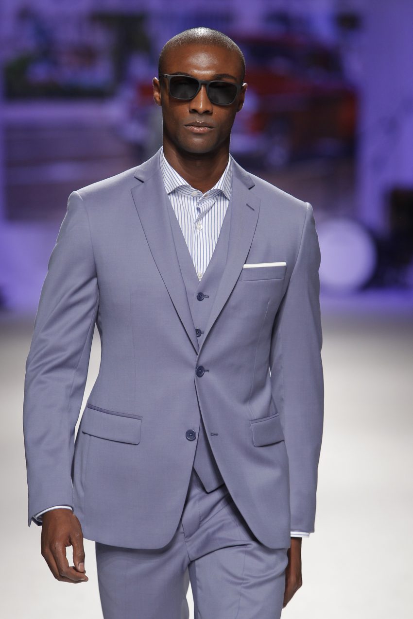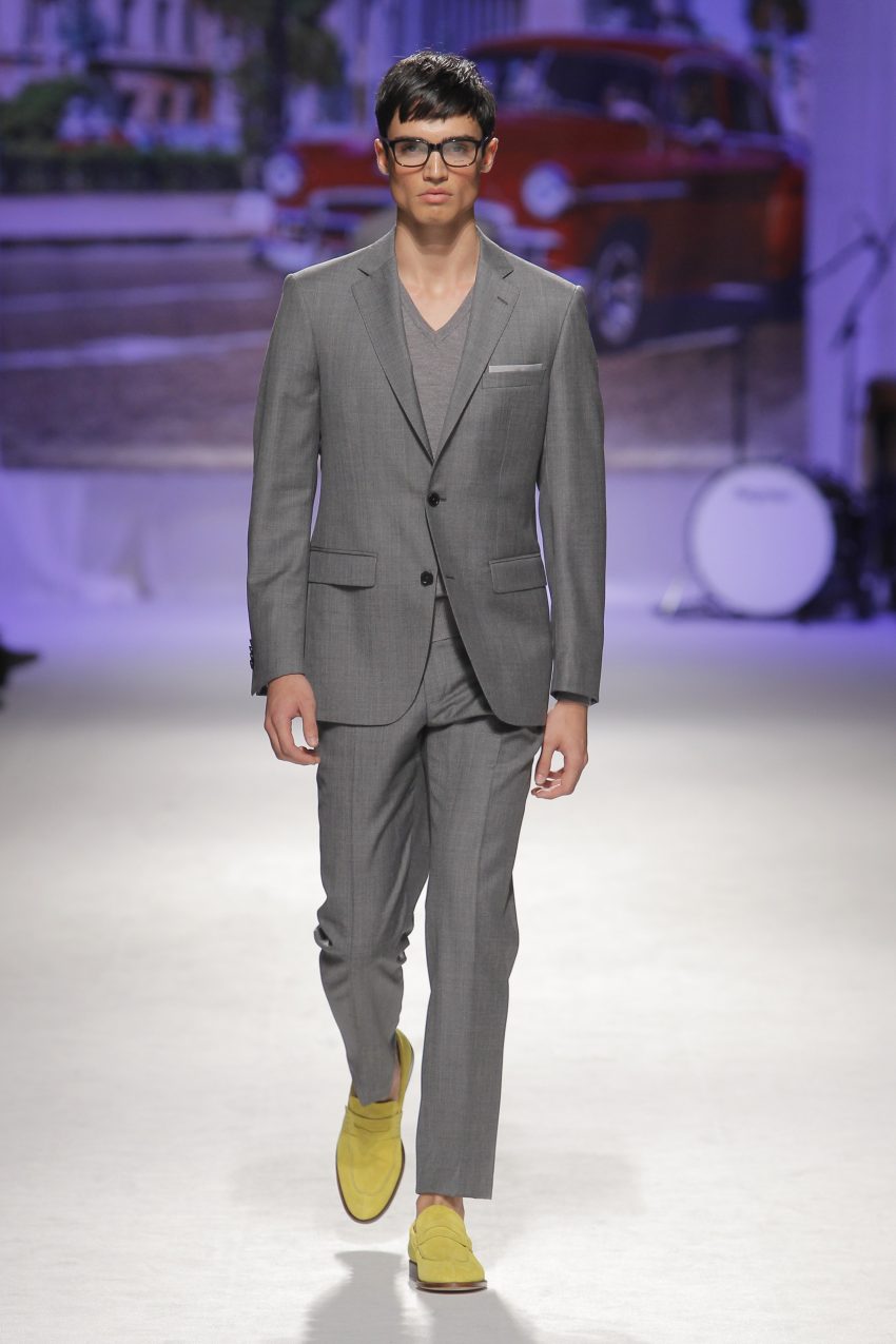 Os fatos slim fit são em lã/seda, lãs Super 130’s, 150’s e 170’s, sempre com um aspeto bastante moderno e minimalista.